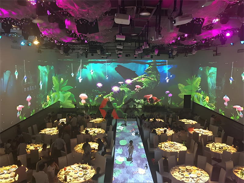 這波光影革命甚至催生新型社交禮儀。當兩位賓客的禮服顏色相撞,墻面投影會自動生成柔光濾鏡;商務宴請時,智能系統能識別企業logo生成專屬背景墻。有位老板在競標宴上放出"海底兩萬里"特效,成功讓甲方爸爸在鯨魚肚子里簽了合同——后來這招被同行稱為"溫柔綁架術"。