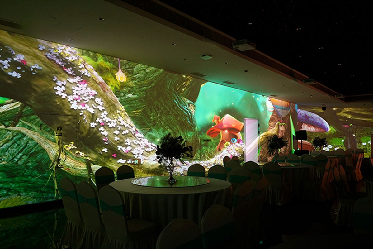 簡要描述:山東東營智谷齊星酒店5D全息宴會廳,是將大型環廳全息環幕天幕幻影成像的新型宴會廳,是一種將T臺互動、聲、光、電以及星空頂等科技元素結的宴會廳,全方位的展現出完美婚宴場景。...