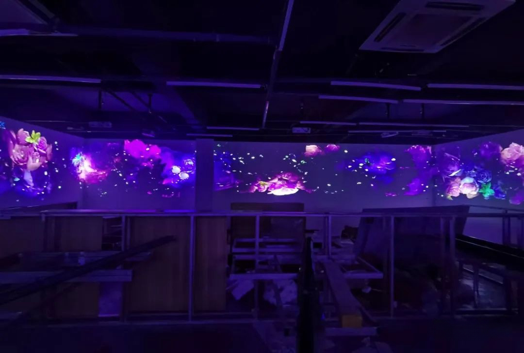 Products Classification最近在河北霸州的一家火鍋店完工了,整個店鋪150平米左右整體做沉浸式投影,從客戶的預算和現實的環境來制定落地方案,現場總共用了9臺專業迪恒投影儀,餐飲專用融合服務器,用時3天完成現場的安裝。
