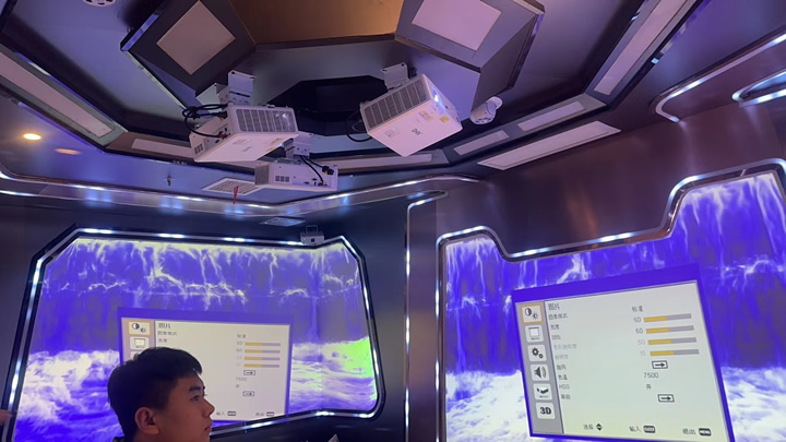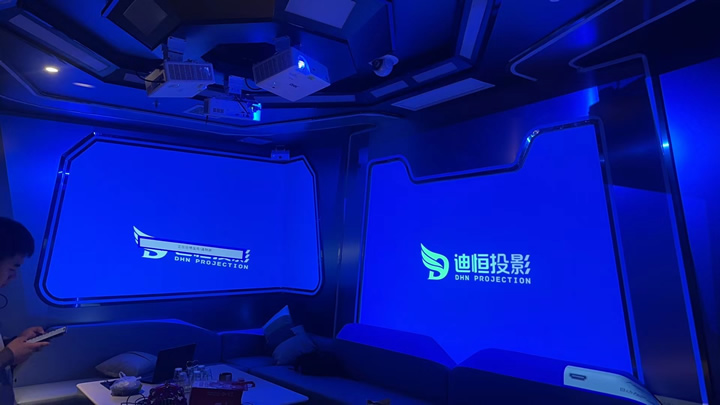 近期,音維公司前往江蘇昆山千燈鎮,所打造的KTV投影融合系統是將3D圖像內容投射在KTV包廂內,在亦真亦幻的虛擬場景通過圖像融合系統,打造出沉浸式的光影互動體驗。